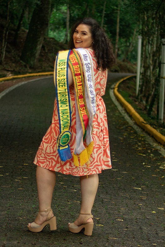 A candidata de primeira viagem ficou encantada com a variedade de corpos e histórias que encontrou no concurso. “Foi a melhor experiência da minha vida, porque ali eu entendi que realmente eu poderia ser do jeito que eu era. Eu vi tantas mulheres ali, eram 40 e poucas participando, e foi muito enriquecedor”. Mesmo perdendo o concurso, ela conta que se sentiu vitoriosa por conviver com mulheres de todos os tamanhos e ver que ali era seu lugar, prometendo a si mesma que seguiria competindo. Ela foi nomeada Miss Santa Cruz Plus Size em 2015 e 2016, concorreu ao Miss Rio Grande do Sul, ficando em 4º lugar em 2018, e em 2019 foi a grande vencedora, o que a levou para o Miss Nacional Plus Size neste ano.