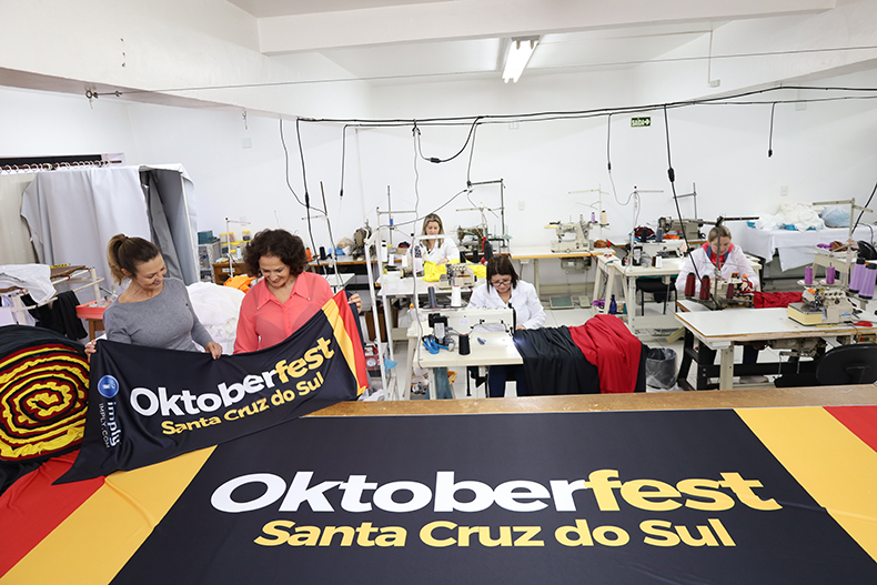 As costureiras da Center Tecidos trabalham nos últimos detalhes das bandeiras que levarão a alegria da Oktoberfest para as ruas