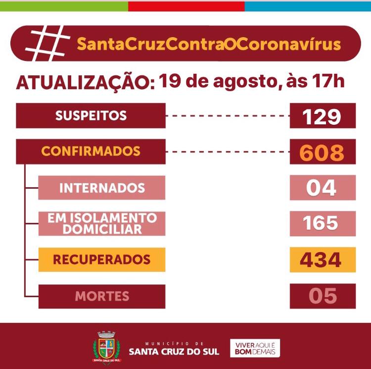 A Secretaria de Saúde ainda acompanha 129 casos suspeitos de Covid-19. Cinco destes estão hospitalizados: três mulheres e um homem, com idades entre 51 e 94 anos, no Ana Nery; e uma mulher de 61 anos no HSC. Santa Cruz do Sul já teve confirmação de cinco mortes causadas pela doença.