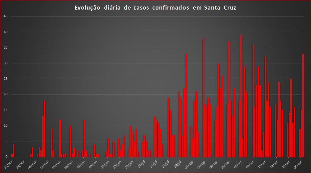 Há cinco moradores de Santa Cruz com teste positivo para o novo coronavírus internados no Hospital Ana Nery e três no Hospital Santa Cruz. São seis mulheres e dois homens, com idades entre 29 e 81 anos.