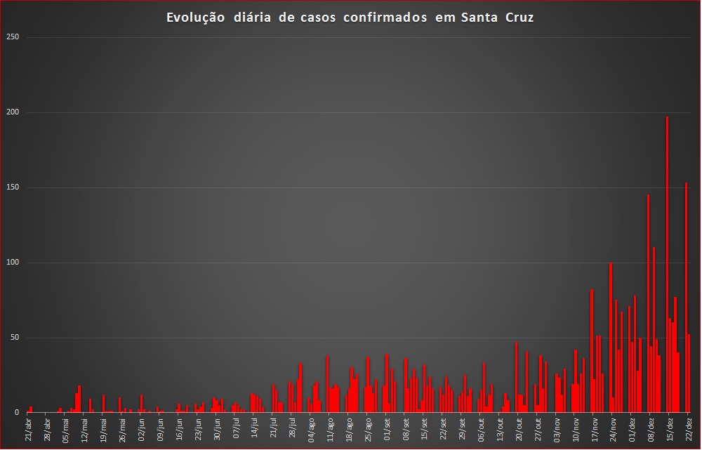 Deste total de moradores de Santa Cruz com confirmação da Covid-19, 3.110 estão recuperados. Vinte e duas pessoas que foram infectadas pelo novo coronavírus no município faleceram.