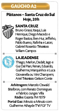 Líder com dez pontos, o Santa Cruz enfrenta o Lajeadense, vice-líder com sete, na noite desta quarta-feira, 27, no Estádio dos Plátanos. A partida vai começar às 20 horas. O técnico Wiliam Campos terá os desfalques do zagueiro Diego Rocha e do atacante Wallan Luan, suspensos pelo terceiro cartão amarelo. A escalação deve contar com Luis Henrique e Rafinha como substitutos.