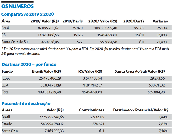 Santa Cruz teve este ano 611 Documentos de Arrecadação de Receitas Federais (Darfs) de destinação a projetos sociais, com o incremento de 89 em relação aos 522 do ano passado. Conforme Padilha, o crescimento deve-se à possibilidade de, neste ano, também ser possível encaminhar mais 3% para o fundo do idoso. Dessa forma, em 2020 houve a possibilidade de direcionar 3% do imposto devido para o fundo do Estatuto da Criança e do Adolescente (ECA) e mais 3% para os fundos do idoso.