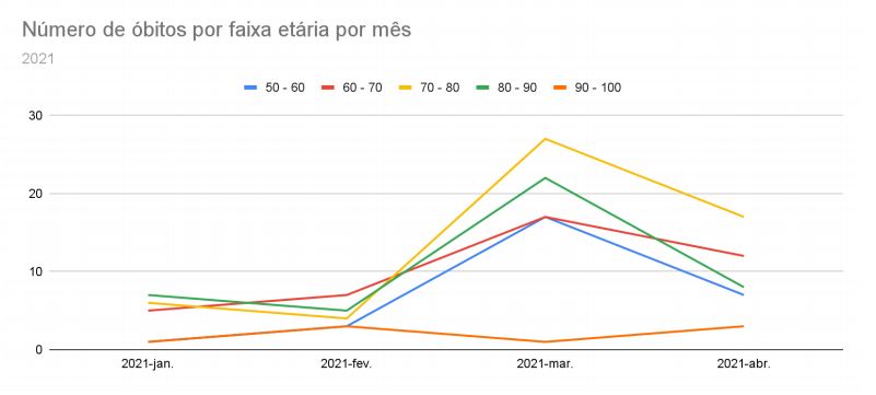 Segundo os gráficos apresentados pela Administração Municipal, há uma grande chance de a vacinação dos grupos prioritários, em especial os idosos, já ter reflexos nos dados: “Uma informação importante é que, em relação a março, houve uma redução de 64% no número de mortes em pessoas acima dos 80, e de 37% daqueles entre 70 e 79 anos, muito provavelmente já reflexo das ações de vacinação nestes grupos.”