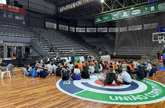Crianças e jovens de escolas públicas e de projetos sociais voltados ao basquete participaram de um bate-papo com ex-atletas e de atividades práticas de basquete com os técnicos das seleções gaúchas, nas tardes de terça-feira, 30, e quarta-feira, 1º, no ginásio Poliesportivo Arnão.