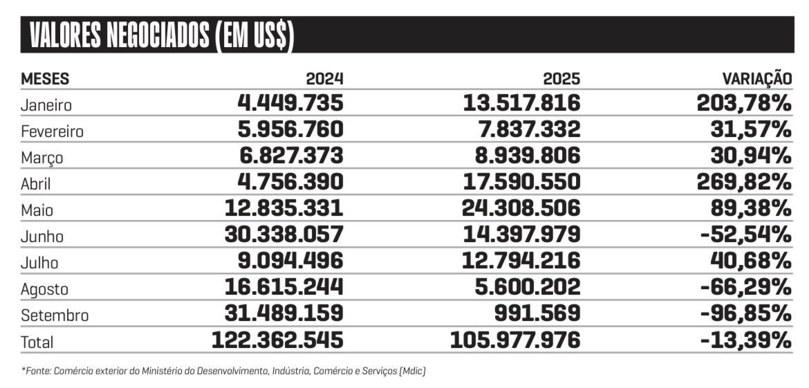 O tarifaço do presidente dos Estados Unidos, Donald Trump, sobre a compra dos produtos brasileiros atingiu em cheio a economia santa-cruzense. Em setembro, segundo mês de vigência das novas taxas, houve uma redução de 96,85% nos valores negociados. O principal setor impactado é o de tabaco, que teve retenção de 30% do que já havia sido negociado com os clientes norte-americanos.