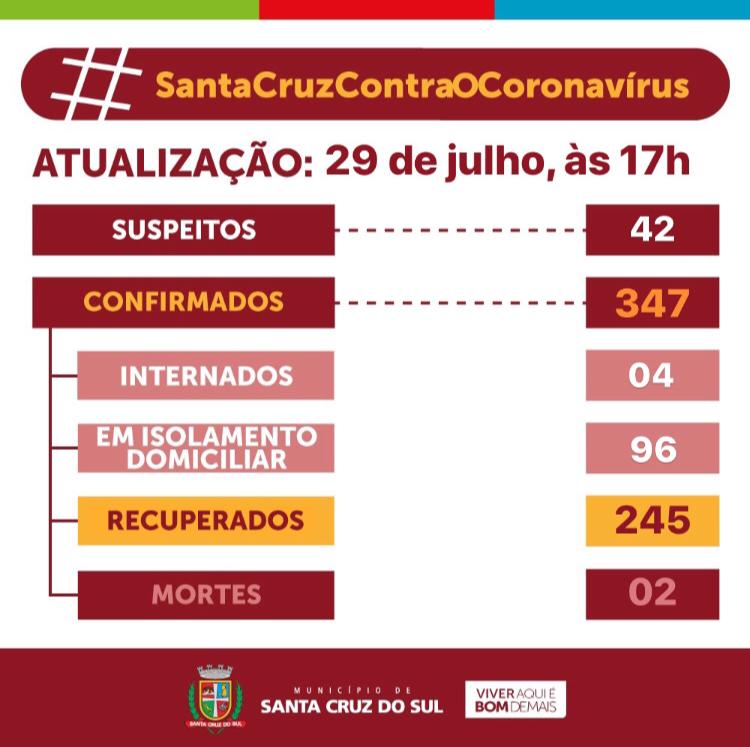Desde o início da pandemia, Santa Cruz do Sul teve 347 testes positivos para a infecção pelo novo coronavírus. Duas pessoas morreram e outras 245 estão recuperadas.