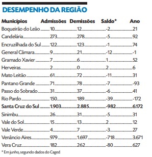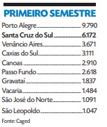 Os números divulgados pelo Cadastro Geral de Empregados e Desempregados (Caged), na quinta-feira, 27, não foram favoráveis ao Vale do Rio Pardo. De 16 municípios, apenas Gramado Xavier, Herveiras e Vale do Sol tiveram resultados positivos na geração de novas oportunidades de trabalho, em junho. No saldo do primeiro semestre, no entanto, a indústria do tabaco mostra a sua força e coloca Santa Cruz do Sul (com 6.172) e Venâncio Aires (3.671) em segundo e terceiro lugares entre os maiores criadores de vagas do Estado, atrás apenas de Porto Alegre.