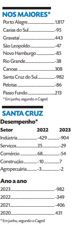 Avaliados separadamente os setores, somente a construção civil teve resultado positivo no sexto mês do ano, em Santa Cruz. Foram sete admissões a mais do que as demissões. A indústria, seguindo o período de encerramento da safra do tabaco, é responsável pelo maior número de demissões. Foram fechadas 904 vagas. Os números são piores do que em 2022, mas refletem a tendência do Estado. Em 2022, o Rio Grande do Sul teve saldo positivo de 7.832, já neste ano, 211 oportunidades foram fechadas.