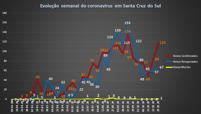 Em Santa Cruz do Sul o avanço da doença nos últimos sete dias é expressivo. São 119 novos casos, segunda maior soma para uma semana, atrás apenas dos 136 registrados em meados de setembro. O número corresponde a 8,1% sobre o total de casos, passando de 1.460 para 1.579. Chama a atenção no município também a quantidade de casos ativos, que chega a 149. Há ainda outros 150 considerados suspeitos. Entre os recuperados, 67 pessoas estão curadas da doença, passando de 1.345 para 1.412, alta de 5%. O saldo é de 52 casos confirmados a mais do que pessoas recuperadas.