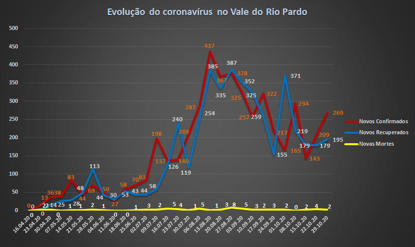 O município tem ainda dez pacientes internados, oito deles com o diagnóstico confirmado para Covid-19 e outros dois aguardando o resultado dos exames. Também houve o registro de um óbito na última quarta-feira – um paciente de 72 anos que faleceu no dia 14 de outubro. Ao longo desse mês, a região registrou um total de 895 novos casos confirmados do novo coronavírus, enquanto em Santa Cruz do Sul esse aumento foi de 329 pessoas infectadas.