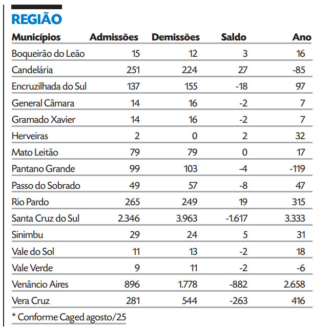 As projeções das entidades e órgãos públicos referente aos dados dos empregos formais para agosto foram confirmadas. O Rio Grande do Sul fechou 1.668 vagas, tendo o saldo negativo puxado pela indústria. Na região, a sazonalidade imposta pela força da cadeia produtiva do tabaco fez com que Santa Cruz do Sul e Venâncio Aires tivessem mais demissões do que admissões. O acumulado do ano, no entanto, é positivo e coloca os dois municípios entre os maiores geradores de trabalho formal do Estado.