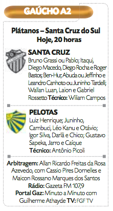 Disposto a apagar o péssimo desempenho diante do Lajeadense no último sábado, o Santa Cruz enfrenta o Pelotas nesta quarta-feira, 1º, no Estádio dos Plátanos, às 20 horas, em duelo que vale a liderança do grupo B no Campeonato Gaúcho da Série A2.