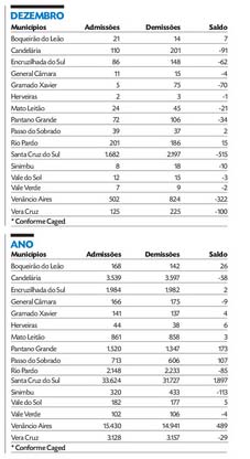 Os números do Cadastro Geral dos Empregados e Desempregados (Caged), divulgados nessa quinta-feira, 30, pelo Ministério do Trabalho e Emprego, mostram um dezembro com saldos negativos. Apenas três dos 16 municípios analisados mensalmente pela Gazeta do Sul tiveram resultados positivos na geração de trabalho formal.