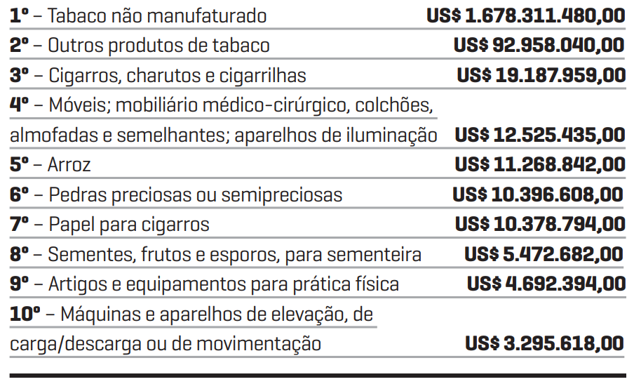 A venda para fora do País de cigarros, charutos e cigarrilhas rendeu mais de US$ 19 milhões. Na sequência, outros produtos também ganham destaque, como móveis, arroz, pedras preciosas, papel para cigarros, sementes, artigos e equipamentos para prática de exercícios físicos e máquinas e aparelhos de elevação de carga/descarga ou movimentação. Na lista aparece ainda o milho como 14º item mais exportado. A receita desse produto foi de mais de US$ 1,6 milhão.