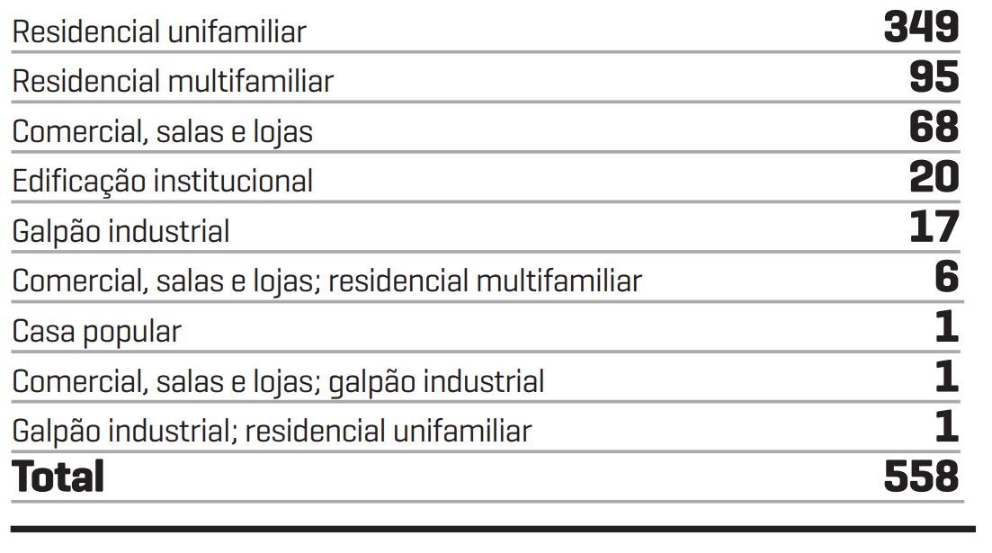 Houve ainda seis processos referentes a reformas e outros seis de regularizações. Do montante, 522 obras são de alvenaria; 33 mistas e três de madeira. Mais da metade é para residências unifamiliares. Em extensão, são quase 139 mil metros quadrados.