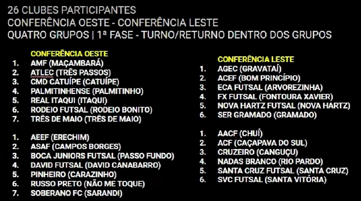 O Santa Cruz Futsal conheceu os adversários que irá enfrentar na primeira fase da Série C do Campeonato Gaúcho de Futsal, pelo grupo B da Conferência Leste: AACF (Chuí), SVC (Santa Vitória do Palmar), Cruzeiro (Canguçu), ACF (Caçapava do Sul) e Nadas Branco (Rio Pardo).