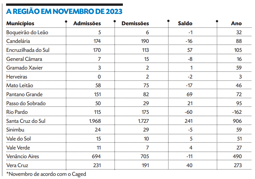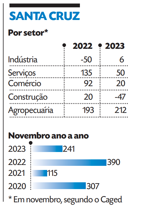 O período que aparece nos números do Caged equivale, ainda, ao de conclusão da colheita do tabaco, que gera contratação de mão de obra e evidencia a relevância do setor para o município. O ramo de serviços destaca-se com 50 contratações – bem abaixo das 135 do último ano, mas ainda um dado positivo. Também aquém de novembro de 2022 está o total de vagas formais em Santa Cruz. Foram 241 neste ano, ante 390.