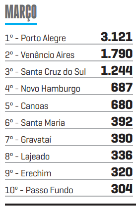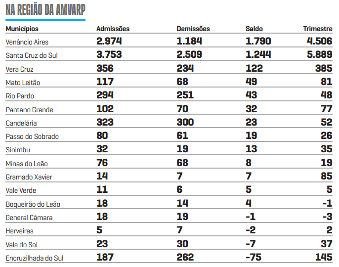 Levando-se em consideração apenas o mês de março, Venâncio Aires teve o melhor resultado no Vale do Rio Pardo. O saldo positivo foi 1.790 carteiras assinadas. Somente a indústria da transformação do tabaco representou 1.674 contratações além das demissões. Santa Cruz do Sul teve, no mesmo setor, 1.146 contratos.