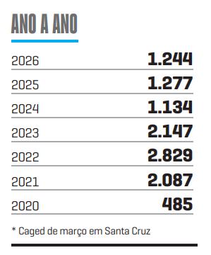 Desde 2020, quando foi adotado o atual sistema de levantamento do Caged, março de 2026 ficou à frente somente do mesmo mês de 2024. Entre 2021 e 2023, os resultados superaram 2 mil contratos. O ano com menor expressão foi 2020, sob influência da pandemia do coronavírus.