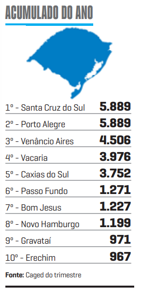 O bom desempenho industrial, resultado da sazonalidade das contratações, fez com que o setor liderasse o saldo de empregos. No País e no Rio Grande do Sul, o segmento de serviços é o que costuma ter os melhores resultados. Em Santa Cruz do Sul, fica em segundo lugar.
