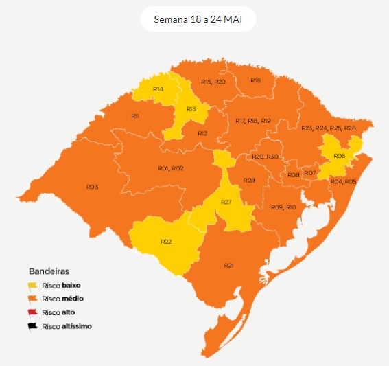 A classificação das regiões de acordo com as bandeiras determinadas pelo Distanciamento Controlado foi atualizada pelo governo do Estado neste sábado, 16. Entre os dias 18 e 24 de maio, não há regiões na bandeira vermelha. A região de Lajeado, que estava na bandeira vermelha, passou para a laranja, e a região de Uruguaiana, que estava classificada como amarela, passa para a bandeira laranja. Para consultar o mapa e a bandeira de cada cidade, acesse o site https://distanciamentocontrolado.rs.gov.br.