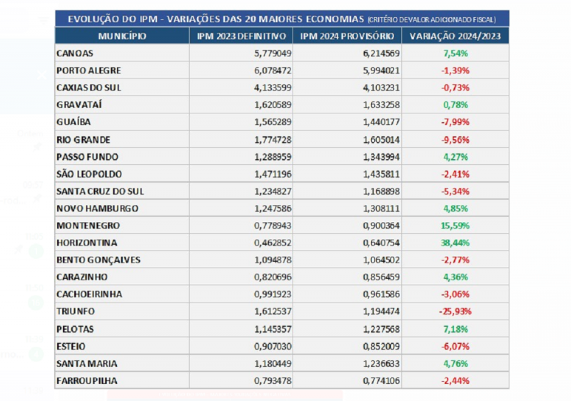 O Índice de Participação dos Municípios (IPM) é o indicador utilizado para a distribuição dos recursos no Estado, determinando a quota-parte de cada uma das 497 cidades gaúchas sobre as receitas do ICMS. Santa Cruz do Sul – uma das 20 maiores economias do Rio Grande do Sul – apresentou uma variação negativa no relatório provisório divulgado pela Receita. Em 2023, o IPM foi de 1,234827. Já para 2024, está em 1,168898, o que representa queda de 5,34%.