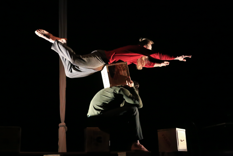 Apresentação da Catavento mostra números com trapézio, tecido e passeio aéreo