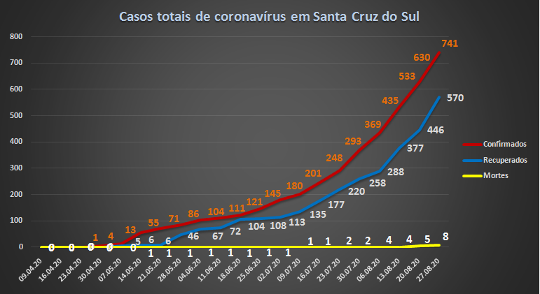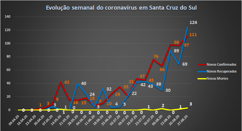Em apenas uma semana, entre os dias 20 e 27 de agosto, Santa Cruz do Sul registrou mais 111 casos confirmados do novo coronavírus. Nesses sete dias, houve um aumento de 17,7% no número total de casos, saltando de 630 na quinta-feira da semana passada para 741 nesta quinta-feira, 27 (veja a evolução semanal no gráfico abaixo). Com isso, os indícios de estabilização sugeridos nas últimas duas quinzenas devem ser suplantados por nova alta quando a segunda quinzena de agosto for considerada no cálculo.