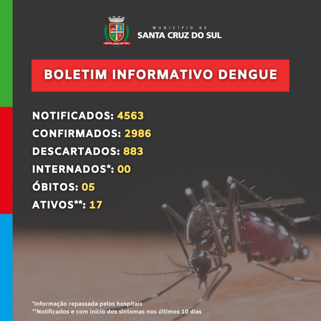 Santa Cruz do Sul registra, até esta quinta-feira, 24, um total de 2.986 casos de dengue. São 239 a mais em relação ao número divulgado na quarta-feira, 16, quando eram 2.747 casos confirmados. Conforme boletim semanal divulgado pela Vigilância Sanitária, 17 estão ativos (notificados e com início dos sintomas nos últimos 10 dias). Não há nenhum paciente hospitalizado com a doença no município.