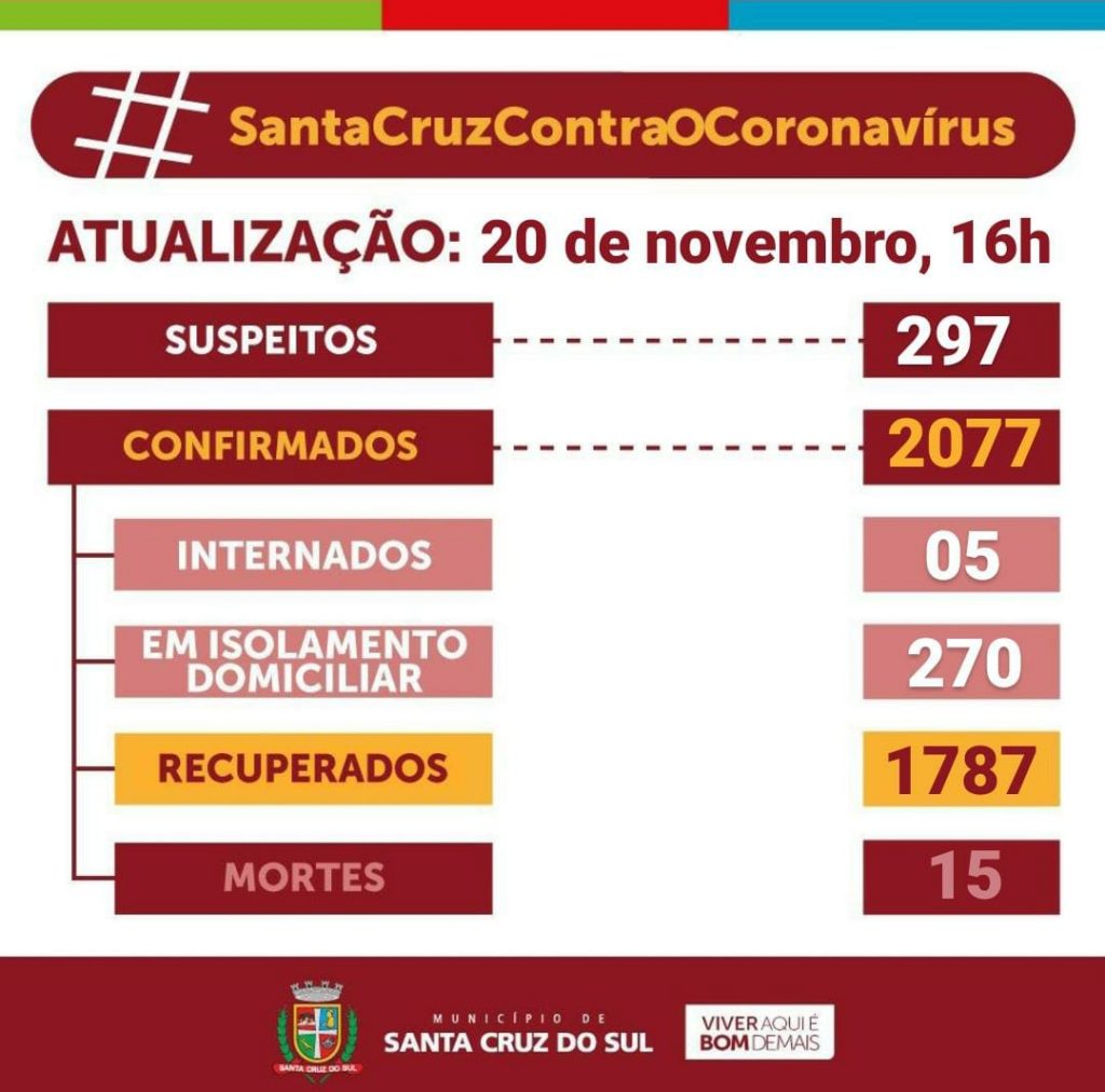 Santa Cruz do Sul chegou nesta sexta-feira, 20, a 2.077 casos confirmados de Covid-19, no acumulado desde o início da pandemia. Foram 26 novos testes positivos contabilizados no boletim da Secretaria Municipal da Saúde.