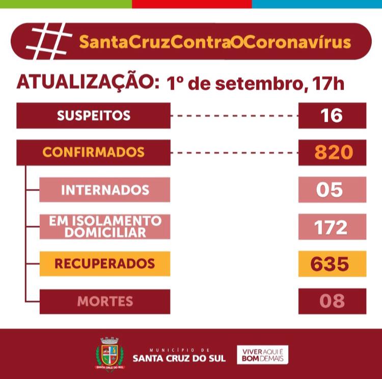 A Secretaria Municipal de Saúde registrou 39 testes positivos para novo coronavírus entre moradores de Santa Cruz do Sul nesta terça-feira, 1º. Os casos ativos são 177, com 172 pessoas em isolamento domiciliar e cinco hospitalizadas.