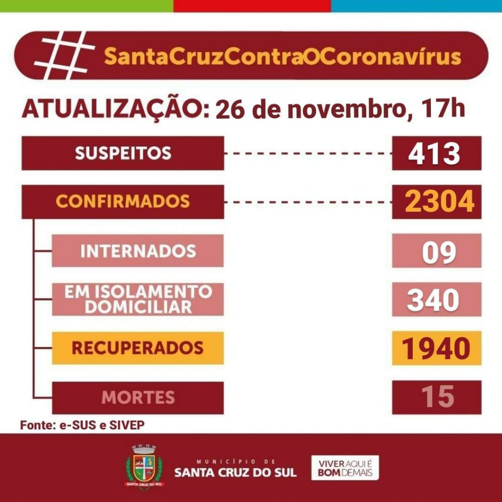 A Secretaria Municipal da Saúde confirmou 42 novos casos de Covid-19 entre moradores de Santa Cruz do Sul nesta quinta-feira, 26. Com isso, o município acumula 2.304 testes positivos para a doença desde o início da pandemia – 15 pessoas faleceram e 1.940 estão recuperadas.
