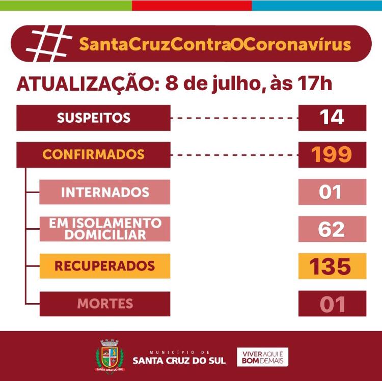 A Secretaria de Saúde de Santa Cruz do Sul divulgou na tarde desta quarta-feira, 8, mais cinco casos de Covid-19. Com isso, o município contabiliza 199 testes positivos. Destes, 62 estão em isolamento domiciliar, 135 estão recuperados e um homem, de 69 anos, está internado no Hospital Ana Nery.