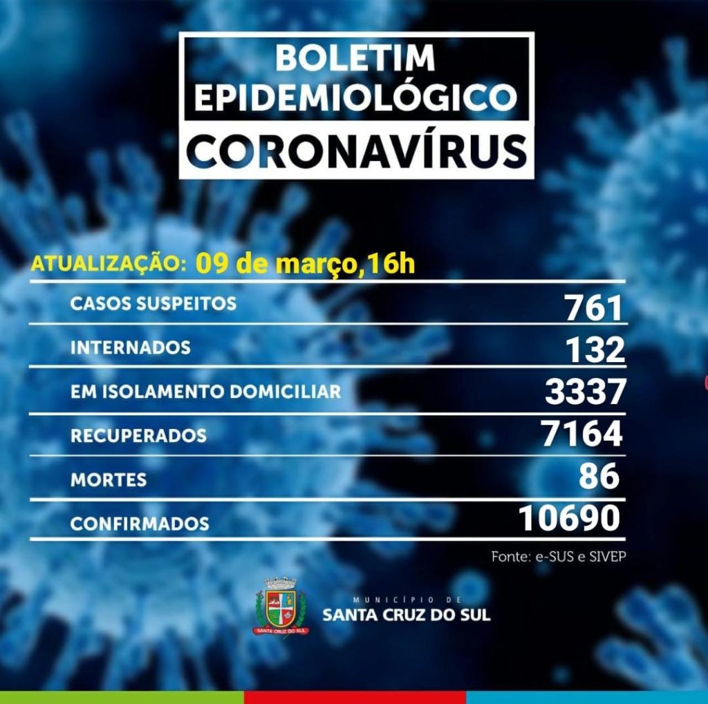Desde o início da pandemia, 10.690 moradores de Santa Cruz já foram infectados pela Covid-19. Destes, 7.164 são considerados recuperados. Há ainda 761 pessoas com suspeita da doença sendo monitoradas e que aguardam resultados de exames.