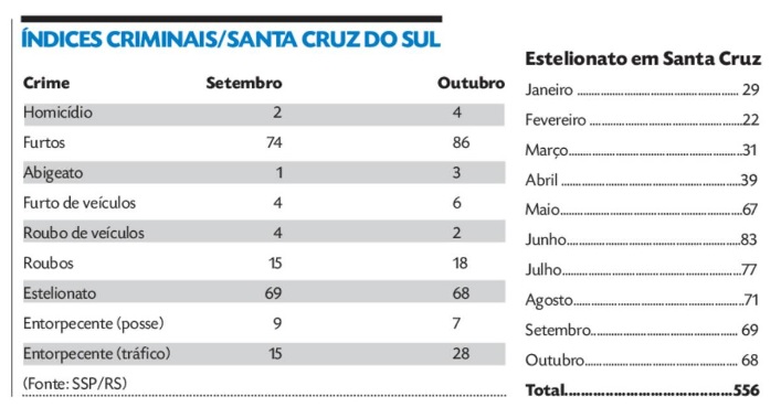 A Secretaria de Segurança Pública do Rio Grande do Sul (SSP/RS) divulgou na última semana os índices de criminalidade no Estado relativos a outubro. Em Santa Cruz do Sul, os números mantiveram-se estáveis na comparação com o mês anterior. Os registros de furtos mostram leve alta entre setembro e outubro, mas uma outra modalidade de crime se destaca pela quantidade de ocorrências. Enquanto o balanço mostra números relativamente baixos para delitos como roubo, furto de veículos ou abigeato, por exemplo (confira no quadro), a quantidade de golpes se mantém alta e estável.