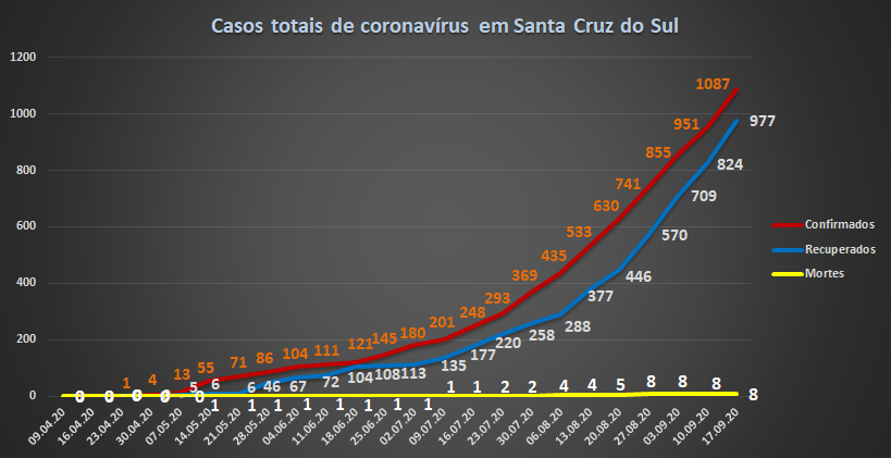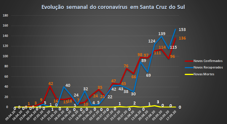 Depois de uma semana em queda e dando indícios de desaceleração, a pandemia do novo coronavírus voltou a registrar crescimento em Santa Cruz do Sul. Nos últimos sete dias, o Município confirmou 136 novos casos da doença, um recorde desde que a contagem começou a ser feita, em abril. Até então, o pico havia sido entre 27 de agosto e 3 de setembro, quando houve 114 casos. Em números, representa um aumento de 14,5% sobre o total, ante os 11,3% verificados na semana anterior.