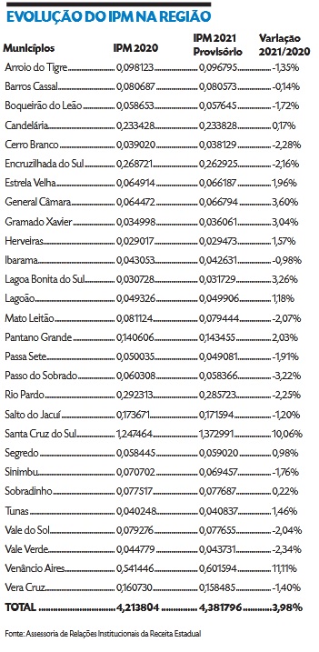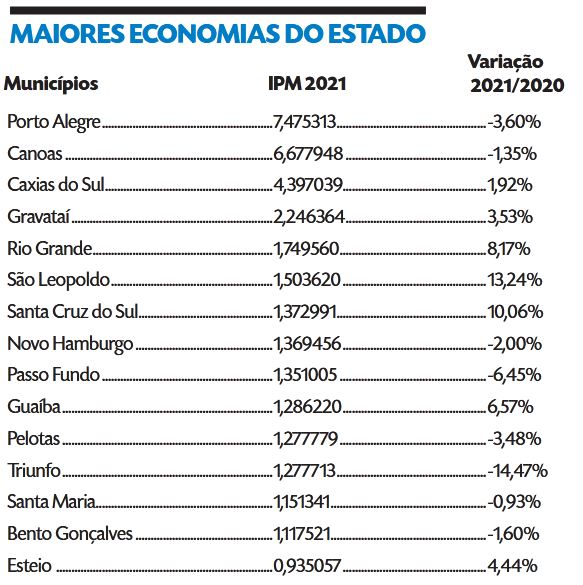 Entre as 20 maiores economias do Estado, conforme o critério de Valor Adicionado Fiscal, dez registraram crescimento e dez apresentaram queda na comparação do IPM Provisório 2021 com o definitivo de 2020. As maiores variações positivas são de São Leopoldo (+13,24%) e Santa Cruz do Sul (+10,06%), enquanto as maiores reduções foram verificadas em Triunfo (-14,47%) e Passo Fundo (-6,45%).