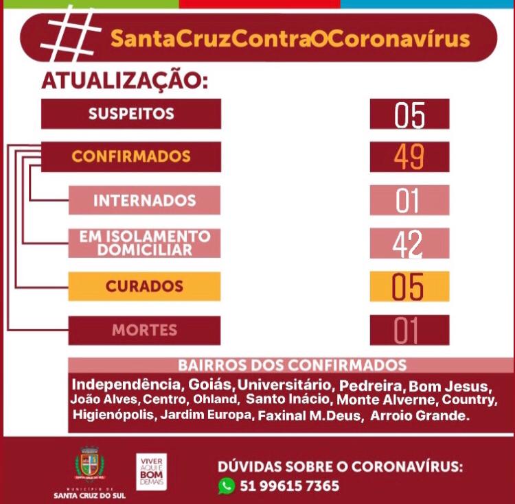 Dos 49 casos confirmados, 42 estão em isolamento domiciliar, um está internado e cinco são considerados recuperados. Em Santa Cruz do Sul, uma pessoa morreu de Covid-19.