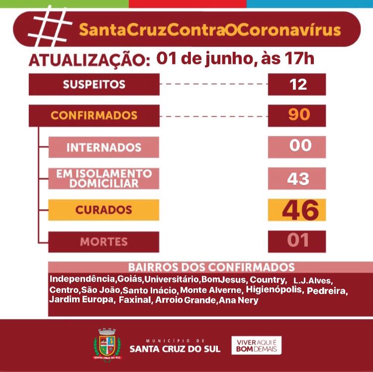 A Secretaria de Saúde de Santa Cruz do Sul divulgou nesta segunda-feira, 1°, que o município possui 90 casos confirmados de coronavírus. Destes, 46 pessoas são consideradas curadas, 43 estão em isolamento domiciliar e cinco estão internadas com suspeita de coronavírus.