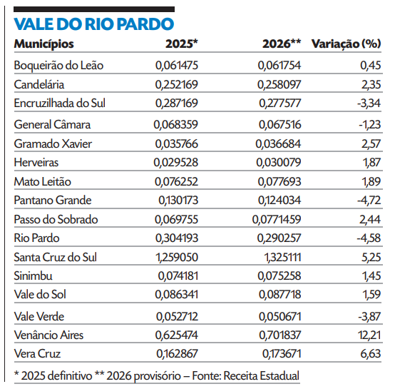 A Receita Estadual divulgou ontem os indicadores que apontam, de forma provisória, a participação de cada município gaúcho no rateio da arrecadação do Imposto Sobre Circulação de Mercadorias e Serviços (ICMS) para 2026. No Vale do Rio Pardo, destacam-se positivamente Venâncio Aires – com uma das maiores evoluções no Rio Grande do Sul, somando 12,2% – e Santa Cruz do Sul – terceiro crescimento entre as maiores economias gaúchas, com 5,25%.