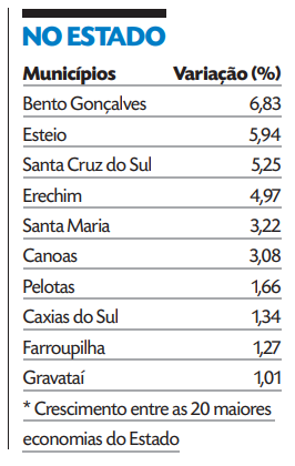 As maiores variações positivas são de Bento Gonçalves (+6,83%), Esteio (+5,94%) e Santa Cruz do Sul (+5,25%). Já as maiores reduções foram verificadas em Horizontina (-23,85%), Montenegro (-10,38%) e Triunfo (-5,75%).