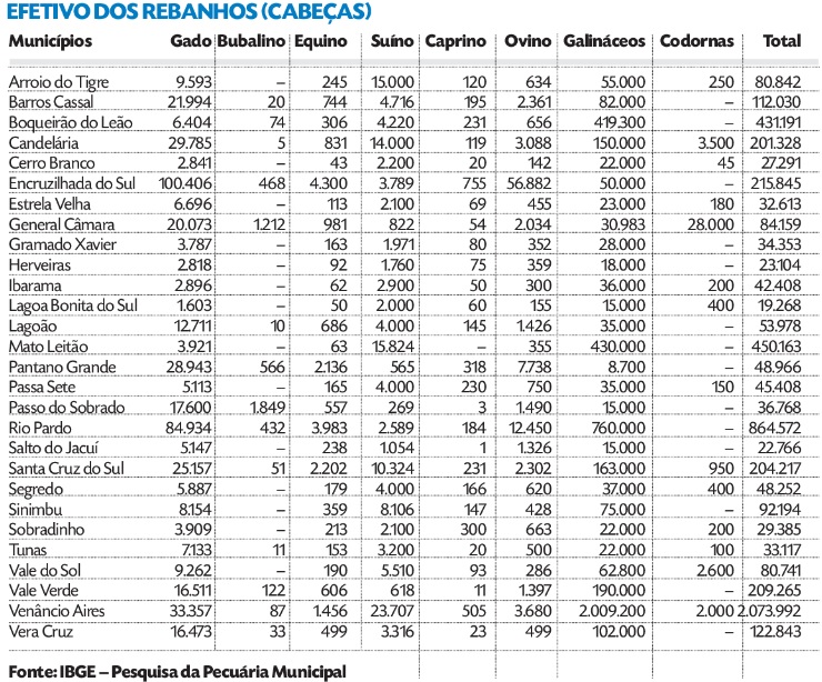 O ranking dos cinco municípios da região com maior efetivo de rebanhos, além de Venâncio Aires, apresenta Rio Pardo, Mato Leitão, Boqueirão do Leão e Candelária. Com menor quantidade de animais aparecem Lagoa Bonita do Sul, Salto do Jacuí, Herveiras, Cerro Branco e Sobradinho. Encruzilhada do Sul e Rio Pardo possuem os maiores rebanhos bovinos, enquanto Passo do Sobrado e General Câmara lideram na produção de búfalos.