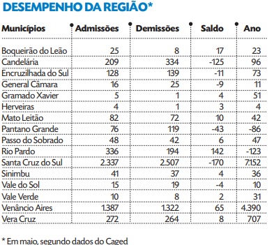 O dado negativo não é exclusividade santa-cruzense. Dos 16 municípios avaliados no Vale do Rio Pardo, seis mais demitiram do que admitiram. A situação se reflete no Estado. O Rio Grande do Sul apontou saldo negativo de 2.511. Enquanto isso, o Brasil abriu 155.270 vagas, um número positivo, apesar de mais tímido do que maio de 2022, quando somou 277.736.