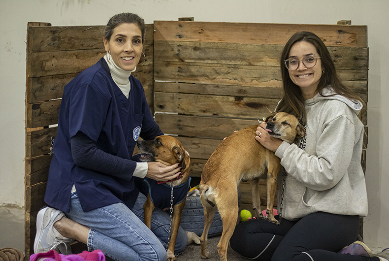 Veterinária Juliana Ferreira Scherer e advogada Paula Cunha auxiliam os 47 cães que permanecem no abrigo no Centro de Eventos