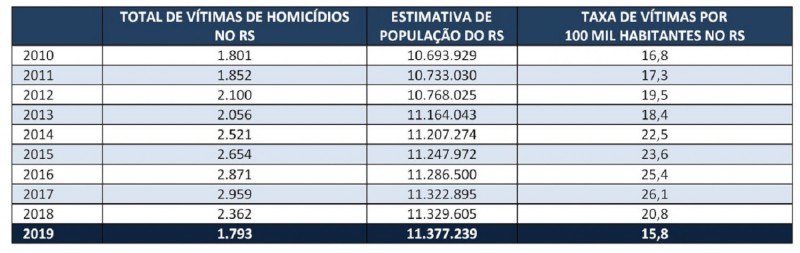 O Governo do Estado divulgou nesta quinta-feira, 9, a consolidação dos indicadores criminais de 2019. Foram registrados, ao longo do ano passado, 1.793 homicídios. Em 2018 tinham sido 2.362 – uma redução de 24%. Com o resultado, considerando a mais recente estimativa de população do IBGE, de 11,37 milhões de moradores no Rio Grande do Sul, a taxa de homicídios do estado caiu ao menor nível em dez anos, para 15,8 a cada 100 mil habitantes. A taxa é cinco pontos menor do que a de 2018. O menor índice anterior (16,8) é de 2010, quando o Estado teve 1.801 mortes por homicídio para uma população de 10,69 milhões de habitantes.