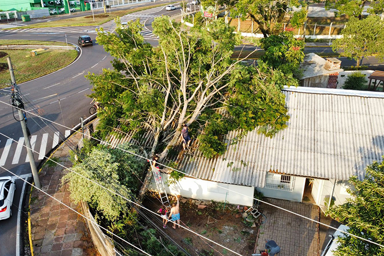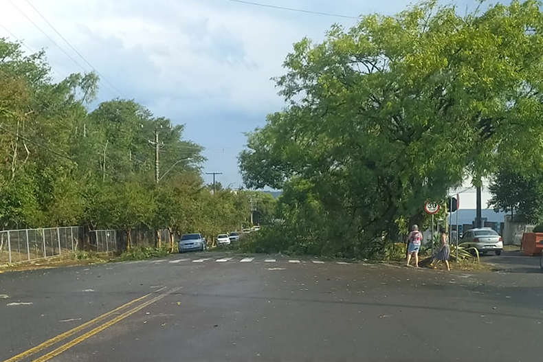 Na Rua Ibanez Lara, paralela com a Arnô Kaempf, mais galhos espalhados e postes de energia elétrica tombados. O bairro e boa parte da cidade ficaram às escuras. Nesse momento, viaturas da Guarda Municipal passavam pelas vias para identificar os casos com maiores danos para fazer a entrega de lonas, evitando outros prejuízos, caso voltasse a chover.