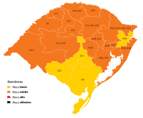 Com a atualização, a nova versão do mapa tem apenas quatro áreas em amarelo – Bagé, Cachoeira do Sul, Pelotas e Taquara –, o restante das regiões está com risco médio. Na atualização divulgada neste sábado, 6, apenas a região de Pelotas apresentou melhora, reduzindo de laranja para amarela.