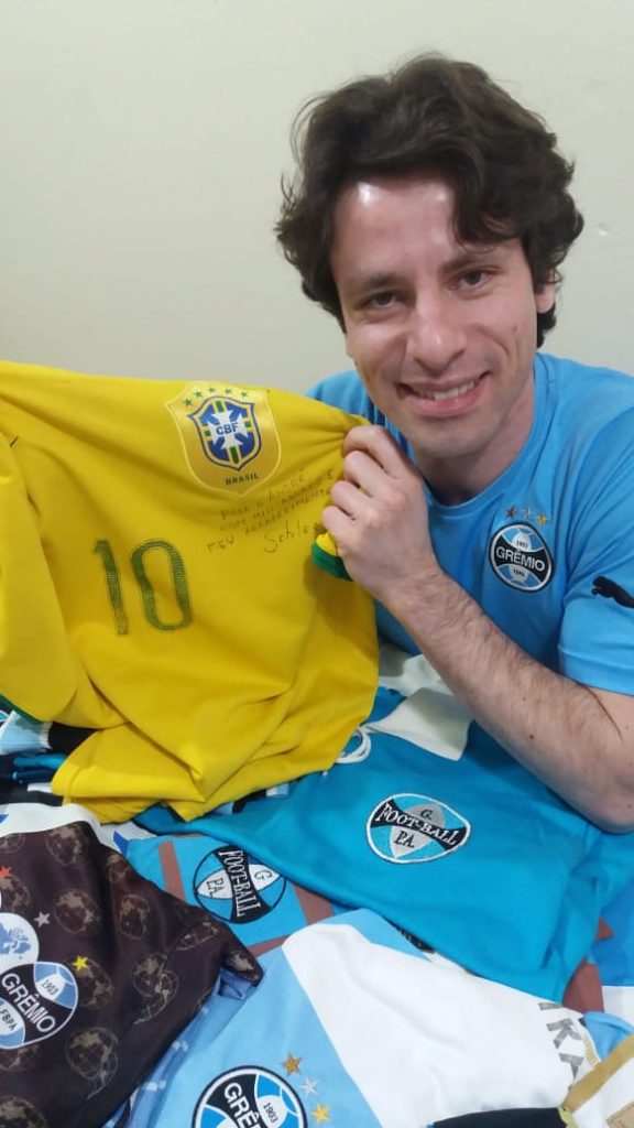 Hoje, entre todas as que guarda no acervo, tem carinho muito especial por duas em particular: as camisas do Grêmio de 1995, a titular e a reserva. “A camisa reserva ganhei do meu pai no Estádio Olímpico Monumental e, para mim, essa camisa me marcou muito, assim como o time daquele ano”, conta. “E outra camisa especialíssima para mim é uma da seleção brasileira (modelo 2006) autografada pelo grande Aldyr Garcia Schlee, desenhista, jornalista, professor, bacharel em Ciências Jurídicas e Sociais, doutor em Ciências Humanas, livre-docente de Direito Internacional, escritor e contista, criador do manto canarinho em 1953. Tirei uma foto com ele no Espaço Gazeta em 2011, na Feira do Livro. Minha camisa da seleção brasileira era uma réplica da seleção de 1970 e depois dei de presente para meu padrinho. A de 2006 mantenho no meu acervo.”