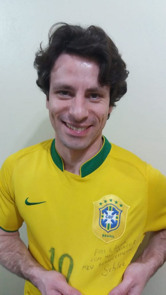 Com a camisa do seu time e a 10 com o autógrafo de Schlee